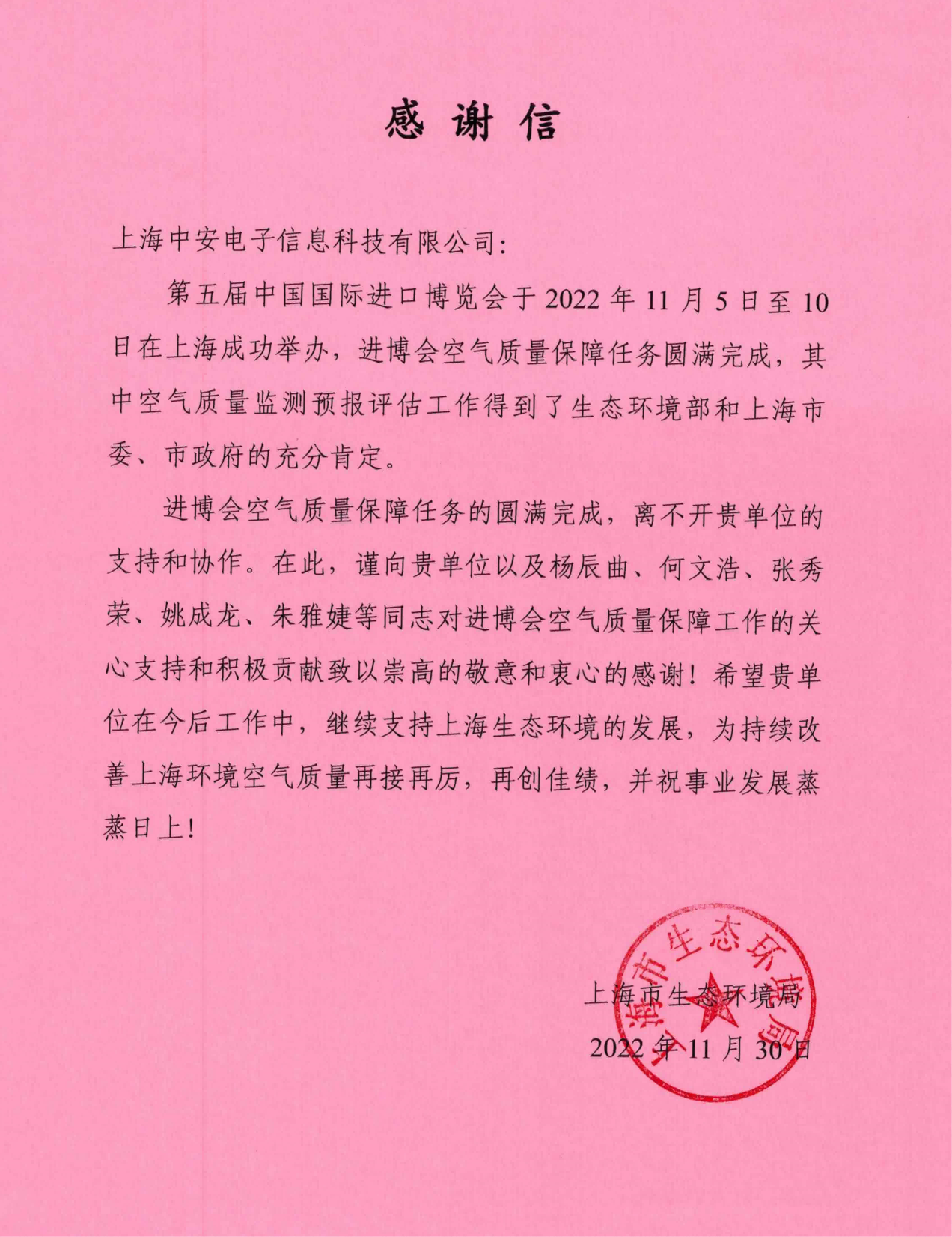 上海市生態(tài)環(huán)境局致上海中安的一封感謝信!(2025-01-10)