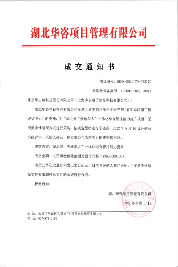 中安科技中標湖北生態(tài)環(huán)科學(xué)院“湖北省‘天地車人’一體化綜合管控提升”項目(2022/10/10)